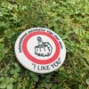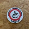 Farben: Rot, schwarz, weiß. Format 75mm im Durchmesser. Mit Hakenklettrückseite und mit passender Flauschfläche