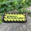 Farben: Schwarz, grün, gelb, grau, braun. Format: 90x90mm. Mit Hakenklett vernäht und mit passender Flauschfläche.