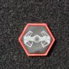 Farben: Hellrot, weiß. Format: 85x85mm. Velcrorücken.