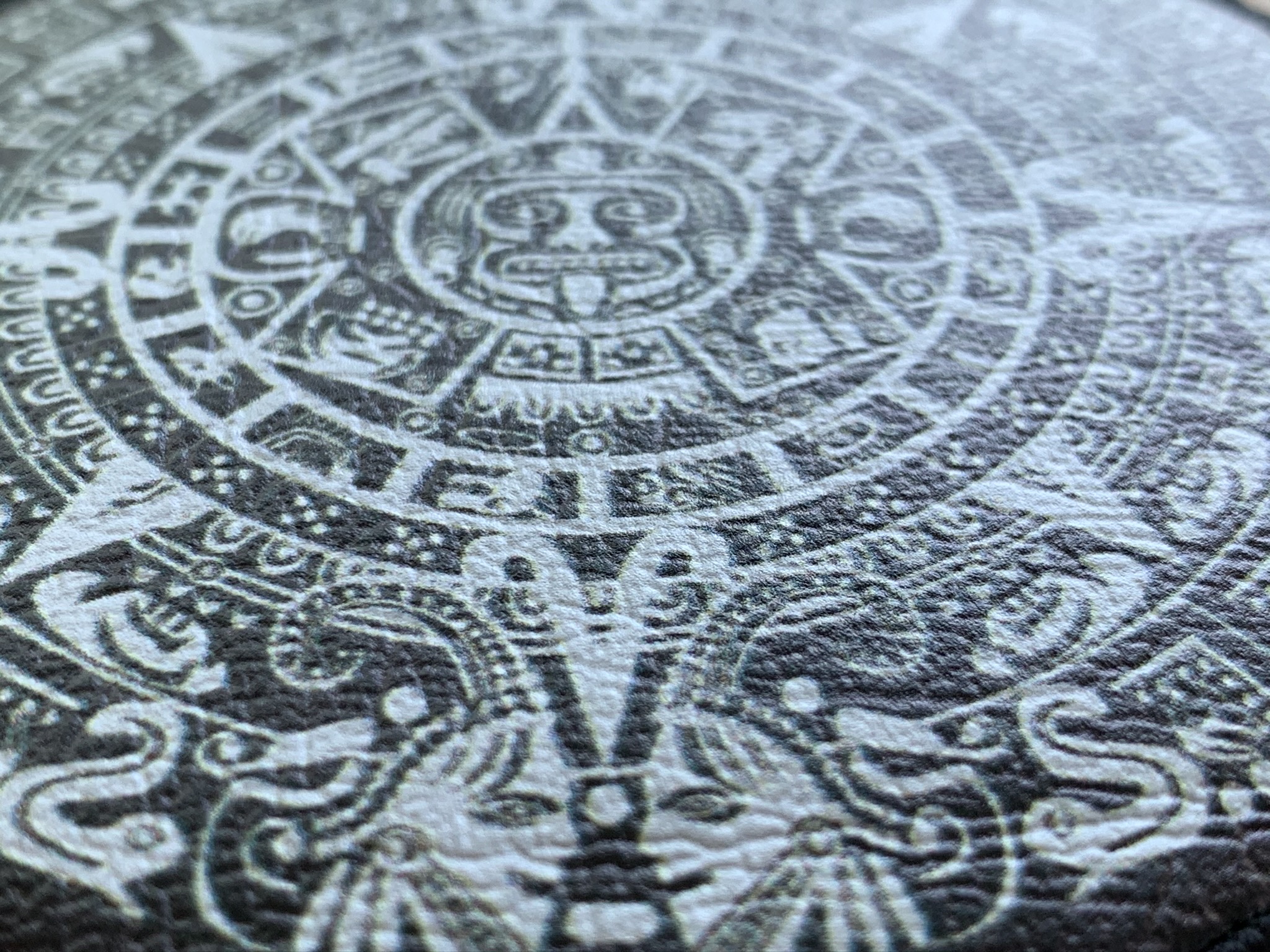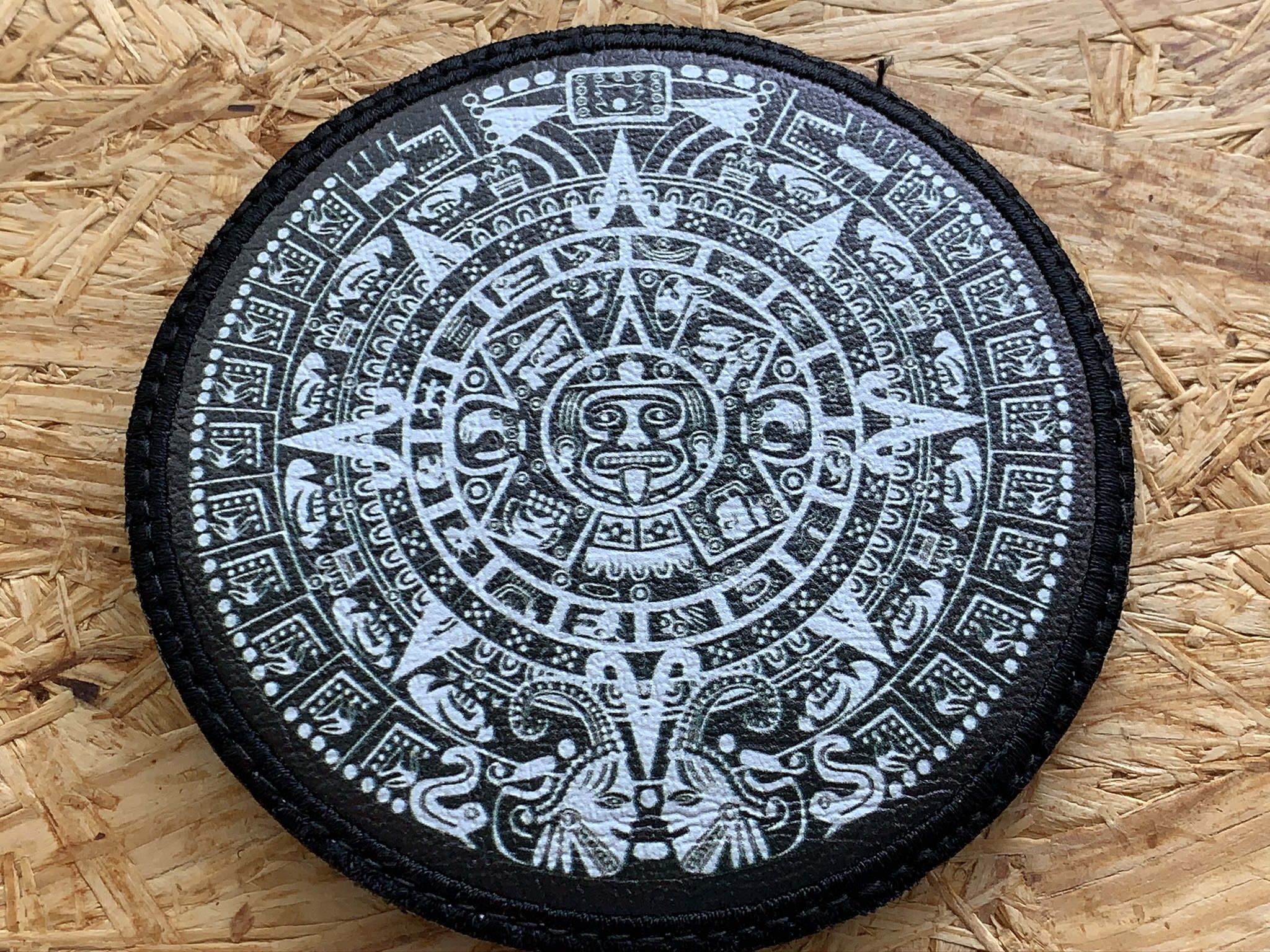 Der uralte Kalender der Mayas in perfekter Qualität auf Leder. Kekettelter Rand, Waschmaschinenfest bis 40 Grad. Robust! Hält jeder Nagelprobe stand!